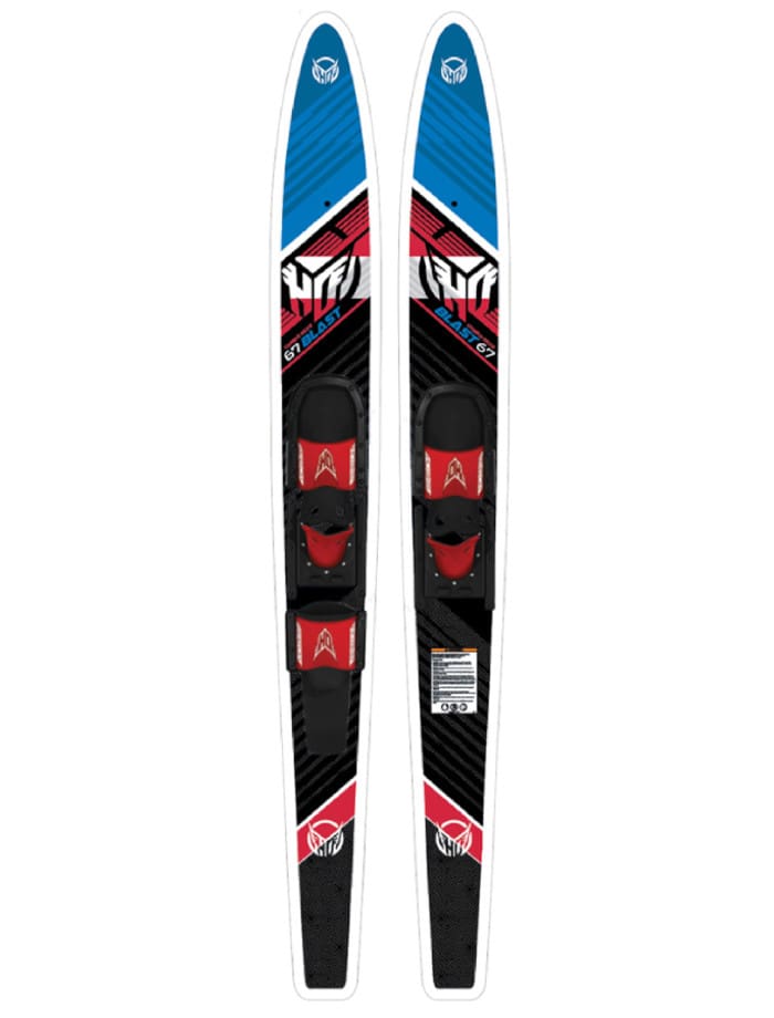 The HO Blast Combo Water-skis are a great way to have fun with the whole family at the lake. Their wide width construction make for easy starts and help skier progress. Combined with a V-Bottom design, the Blast Combos are stable and fun. You can also learn to drop a ski and progress to slalom skiing, as they are equipped with a rear toe strap. Water-skiing is a great way to have fun with the whole family at the lake. They feature tip inserts compatible with the HO Trainer bar that keeps ski tips together, making starting and learning easy.